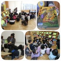 ボランティア「図書ぼっち」の皆さんによる読み聞かせ。 声色・音量を人物や地の文で変えながら読んでいただけました。 子どもたちもよい姿勢で、きちんと聞き入っていました。