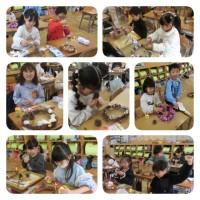 大切に育ててきた「アサガオ」のツルでつくったリースに、木の実・松ぼっくり・わたなどで飾り付けをしました。 目指すは「クリスマスリース」です。 完成して、おうちに飾りたいですね。
