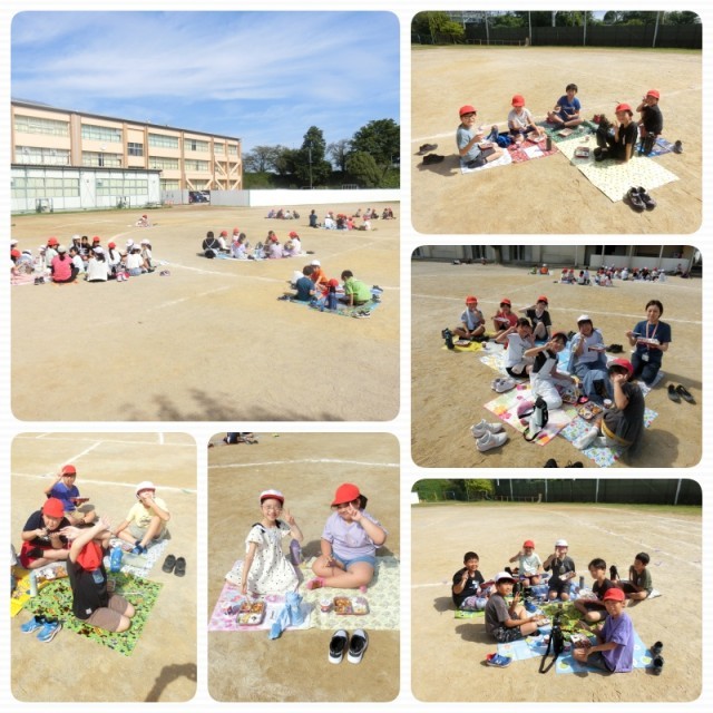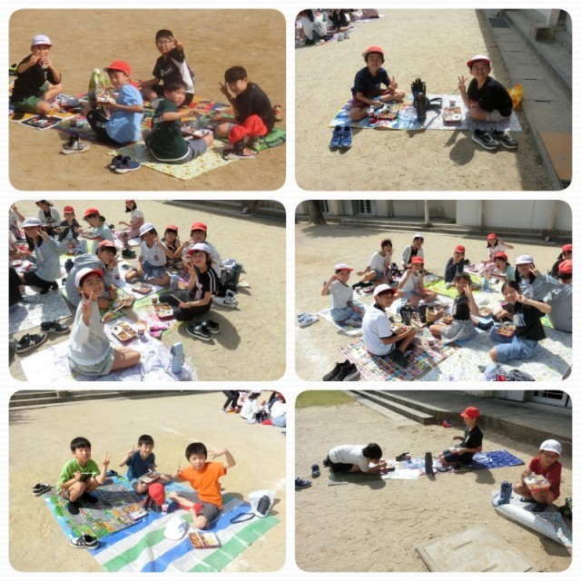 パックに給食を詰め、お弁当風にして、屋外で食べる犬南小恒例の行事です。