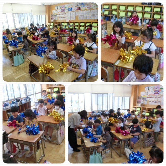 運動会に向けて、1年生がそれぞれ青色・黄色・赤色のボンボンづくりをしていました。