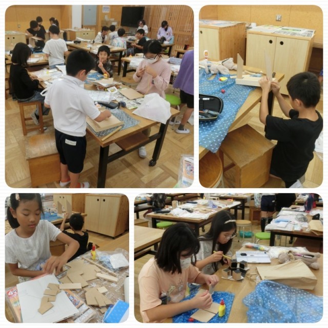 慣れない活動ですが、自分の完成図をもとに、形を切ったり、ボンドでくっつけたりしながら、組み立てていました。
