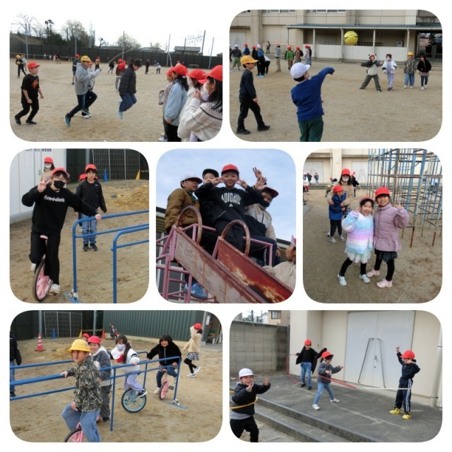 冷たい日ですが、いきいきタイムの時間は、大縄とび、一輪車、フラフープ、ドッジボール・・・と元気よく運動場で遊んでいました。