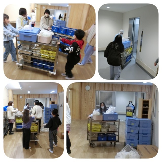 すべてのワゴンは1階まで運び、給食委員が活動します。