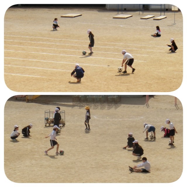 今日は、運動場いっぱい使って、ボールをドリブルしながら動き回っていました。