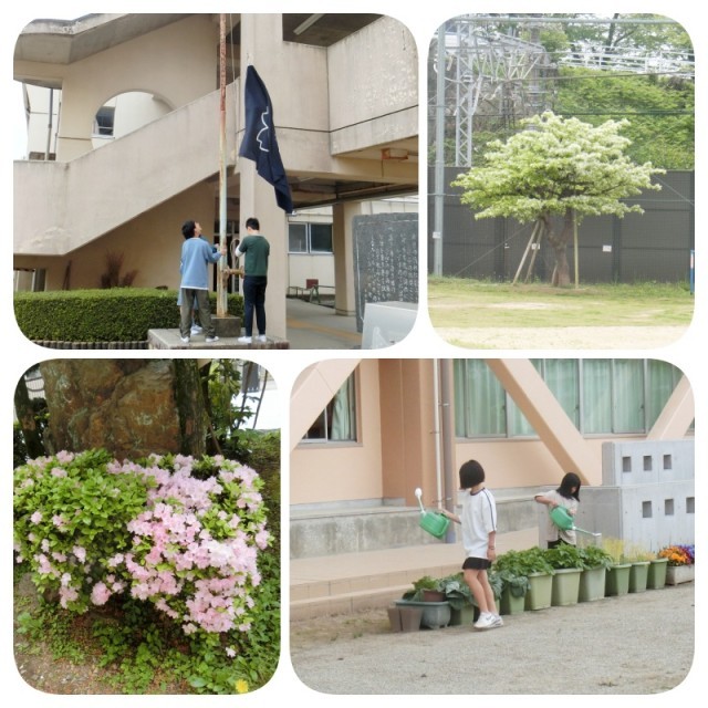 校庭のツツジ、ヒトツバタゴの花が咲き始めました。