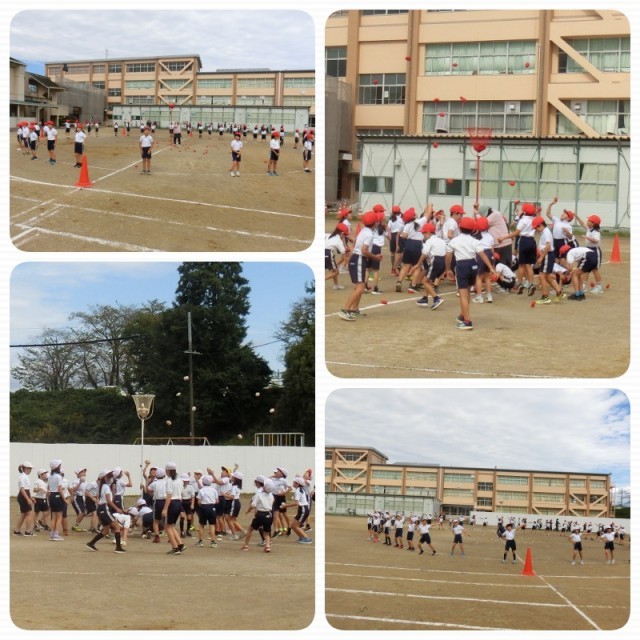 秋らしくなり、3年生が「ポートボール」を元気よく運動場で行っていました。