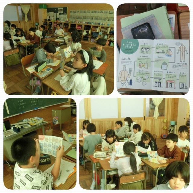 配付されたパンフレットを基に、「生乳」「殺菌」「加工」キーワードを使いながら、原料からつくる上で、安全な食品として製造される過程を理解し、深めていました。