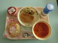 今日は「イタリアの献立」 フォカッチャ 牛乳 カツレツ インサラトーナ(サラダ) ミネストローネ ティラミス デザートのティラミスは、おいしかったね。