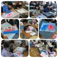 4年生の「木版画」の前に、紙版画に挑戦していました。 でこぼこした素材を貼り合わせ、それをいかしてデザインし、刷る活動をしていました。 インクの付け具合、ばれんでのこすり具合で、色合いが変わってくるこ...