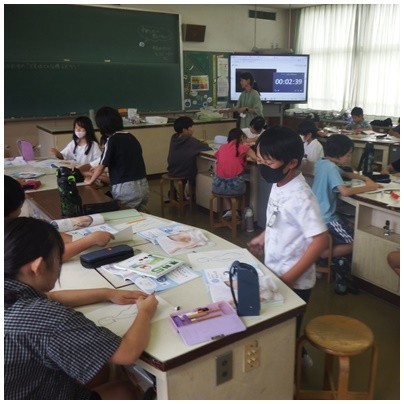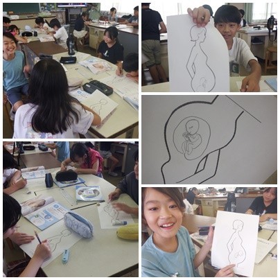 5年生 理科「人のたんじょう」母のおなかの中にいる私。出てくる1日前はどのような姿でしょうか?想像して自分の姿を絵にしました。