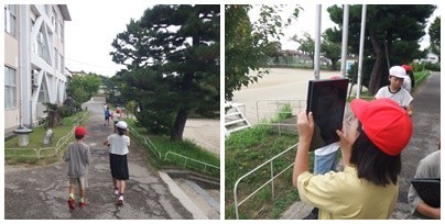 4年生 理科「季節と生物」今日は、校庭に夏の終わりの植物、生物を探しに出かけました。気になったものをタブレットにおさめました。