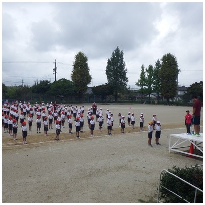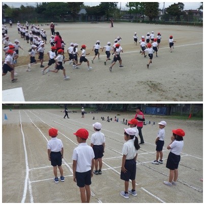 運動会に向けて 1年生と2年生が運動場で練習をしました。頑張っています!
