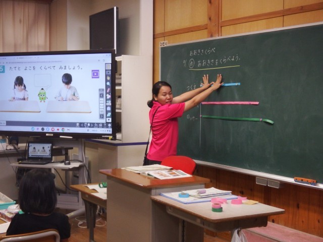 1年生 算数「おおきさくらべ」今日はものの大きさをくらべました。たてとよこをくらべてみましょう!手をつかったり、えんぴつなどもつかってみよう!