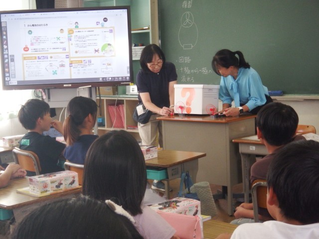 4年生 理科「電流のはたらき」今日は、学習キットを使いながら、プロペラを速く回す方法について考えました。電池に秘密が?モーターに?謎解きが始まります。