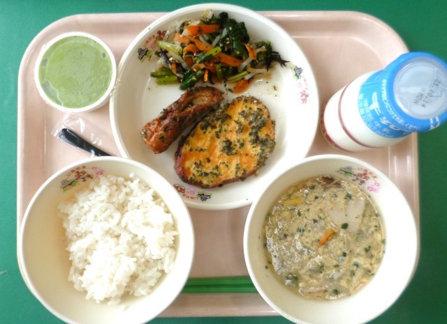 ご飯 牛乳 ちくわの芋の茶衣てんぷら 野菜とひじきのご抹茶和え お茶の葉入りかき玉汁 犬山茶のジェラート