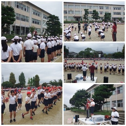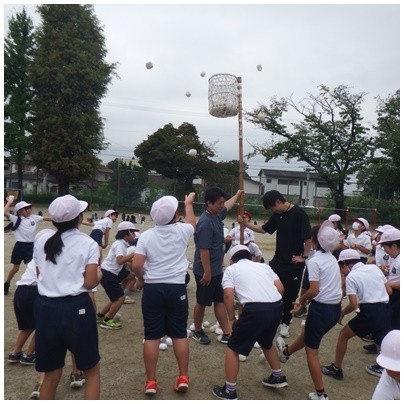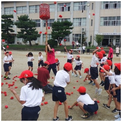 運動会練習 1時間目に全校で、全校種目「ダンシング玉入れ」の練習を行いました。リズムに合わせて元気に踊りました。赤と白に分かれて、玉をかごに向かって投げ入れました。今日の勝敗は!?