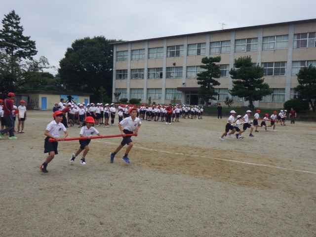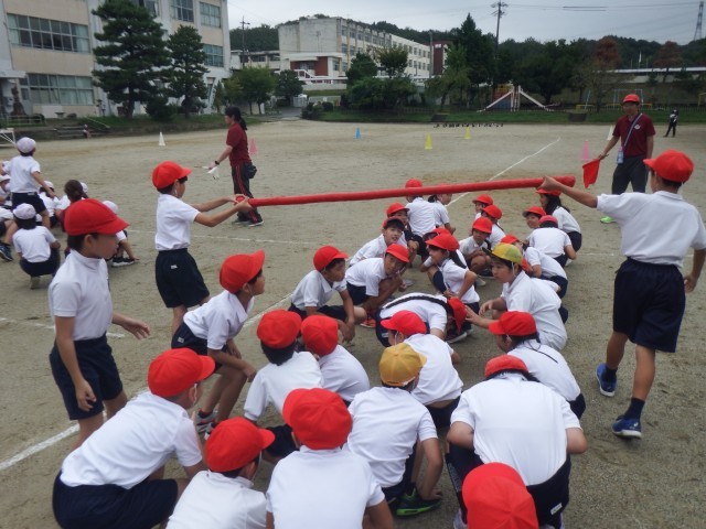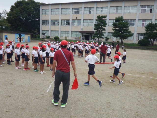 2年生 体育「台風の目」2年生と4年生、ペア学年で運動会練習を行いました。2学年息を合わせて頑張っています!