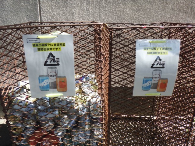 城東小学校PTAは、アルミ缶を常時回収しています。南校舎西側に、アルミ缶入れを設置していますので、来校の際はご協力いただける有り難いです。