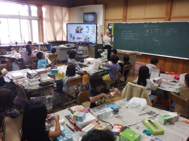 1年生 図画工作「はこで作ったよ」作品の制作をしています。どんな世界が広がるか楽しみですね!