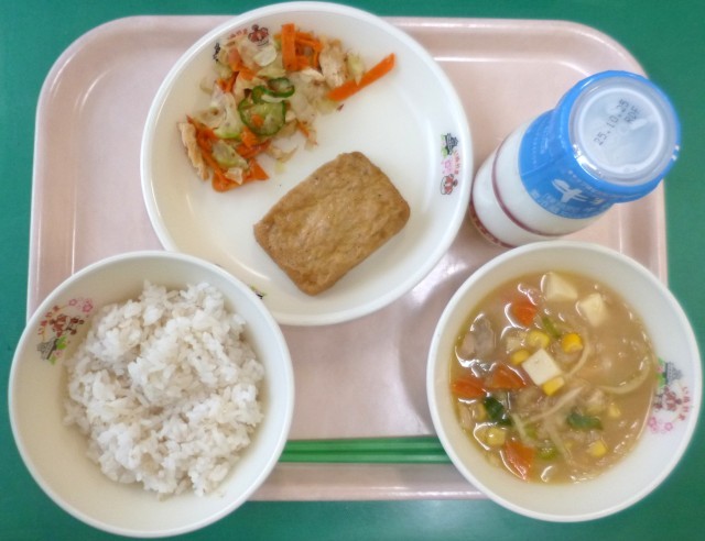 麦ご飯 牛乳 けんちんしのだの煮物 キャベツの梅おかか和え 鶏とコーンの味噌汁