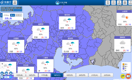 秋雨前線の影響を受け18日(土)は午後から雨天、22日(水)の午前雨天の予報となっています。