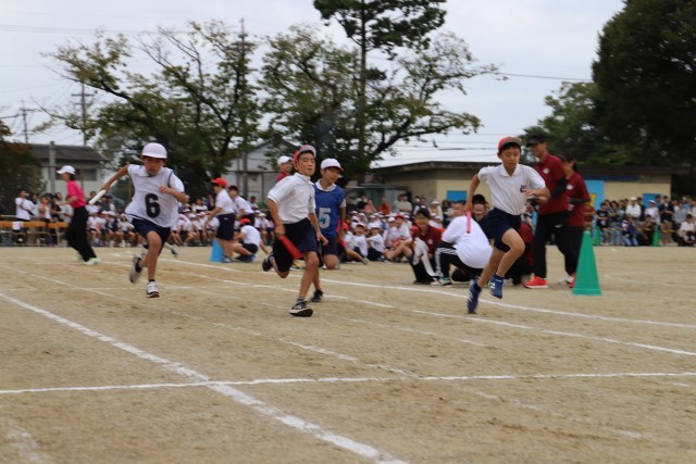 リレーでは,体育の授業で学んだ「テイクオーバーゾーンのバトンパス」に気をつけて本番にいどみました。