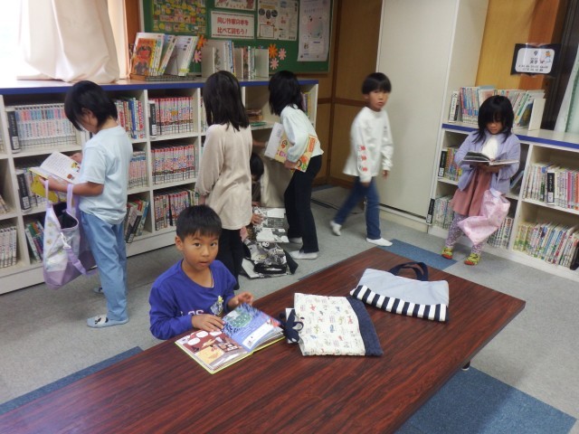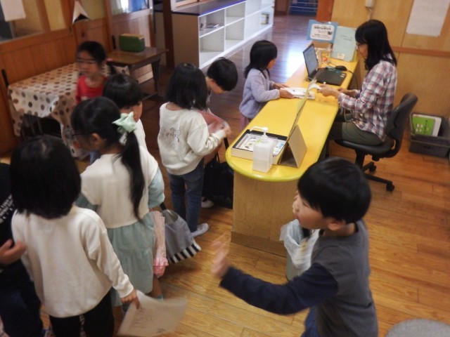 1年生 図書館の活用 図書館に行きました。今日は何を借りようかな!?いきものさがしで見つけた植物や昆虫がのっている本を探しますか?