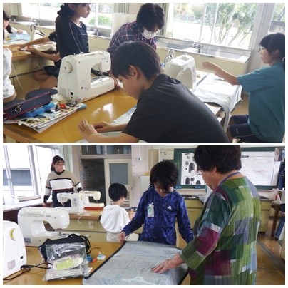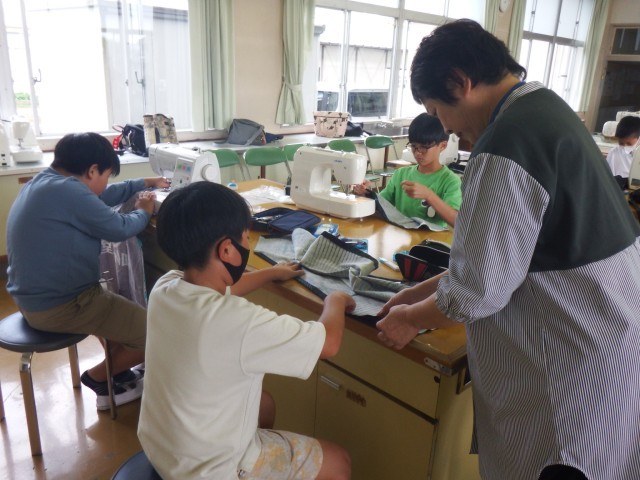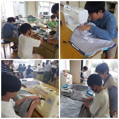 5年生 家庭科「ミシンにトライ!」地域の皆さんに支えていただきながら、エプロン作りを行っています。今日で完成です!一生懸命に作ったエプロンですぜひ活用してくださいね!(城東の里運営協議会)