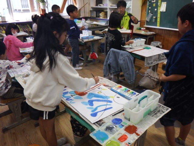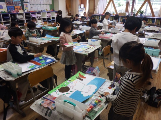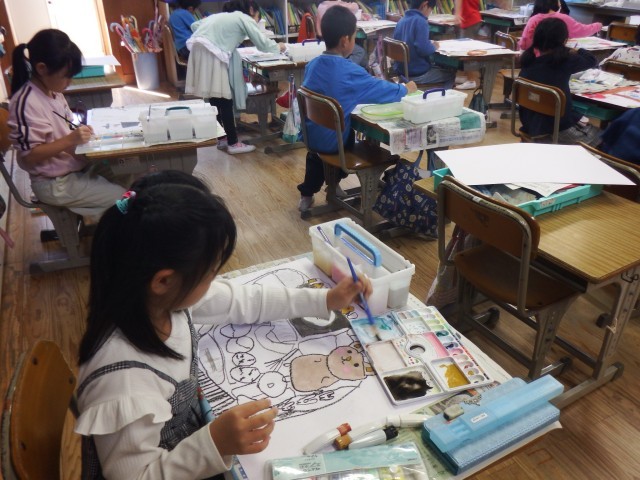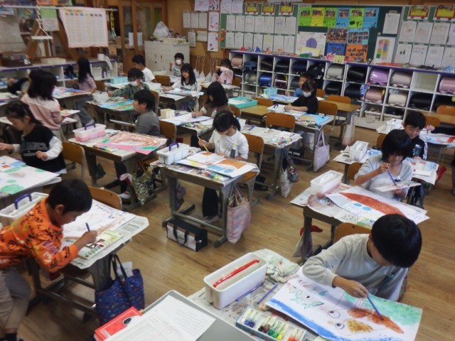 2年生 図画工作「読書感想画」下絵に色つけが始まりました。素敵な読書感想画になりそうですね♪