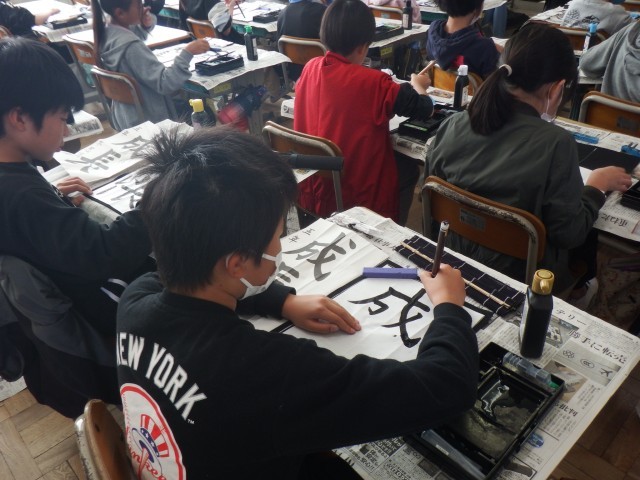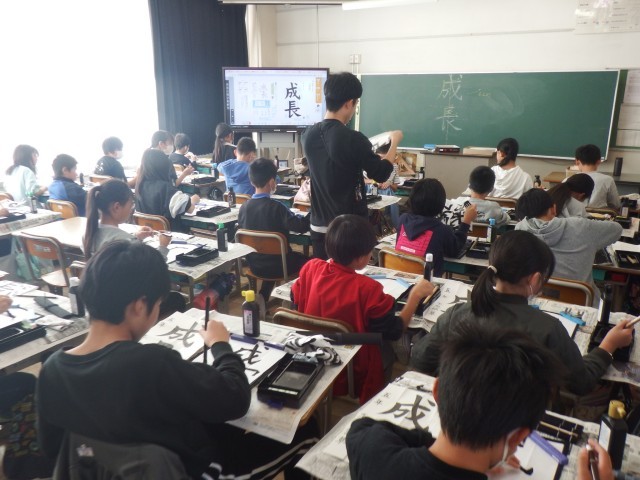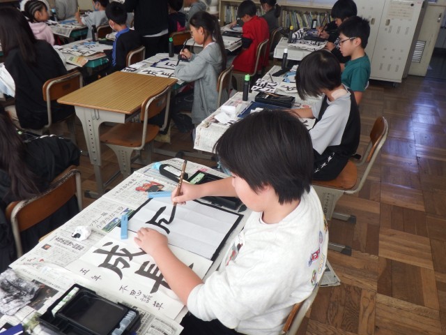 5年生 書写「成長」丁寧に毛筆に取り組みました。画数も多く、バランスよく書けるように努力しています。