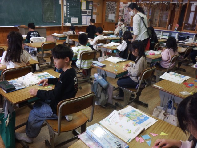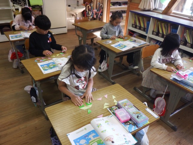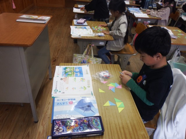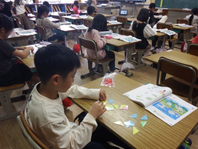 1年生 算数「かたちづくり」いろいたを並べて、いろいろな形を作りました。教科書に出てくる形をつくることができましたね!