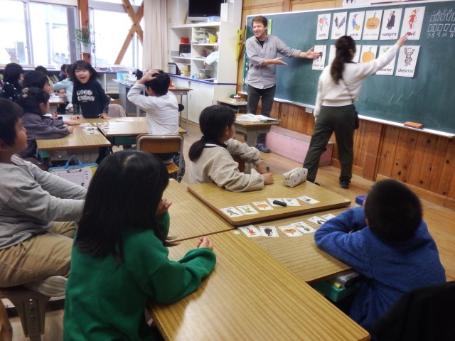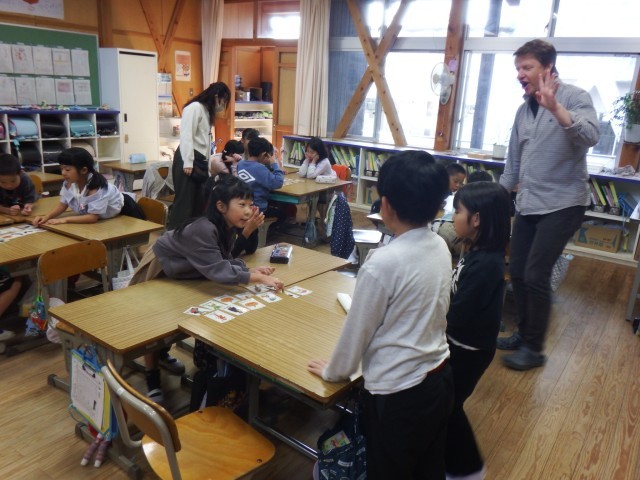 2年生 外国語活動 キャラクターが描かれたカードを使って、ゲーム形式で英語を学びました。