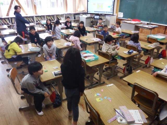 1年生 算数「かたちづくり」いろいたを並べて、いろいろな形を作りをしています。たくさんの形が作れましたね!