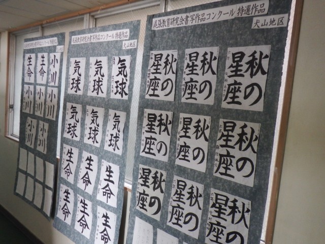 尾張教育研究会書写作品コンクール特選作品が保健室前に期間限定で掲示されています。児童のみんさん見に来てくださいね!