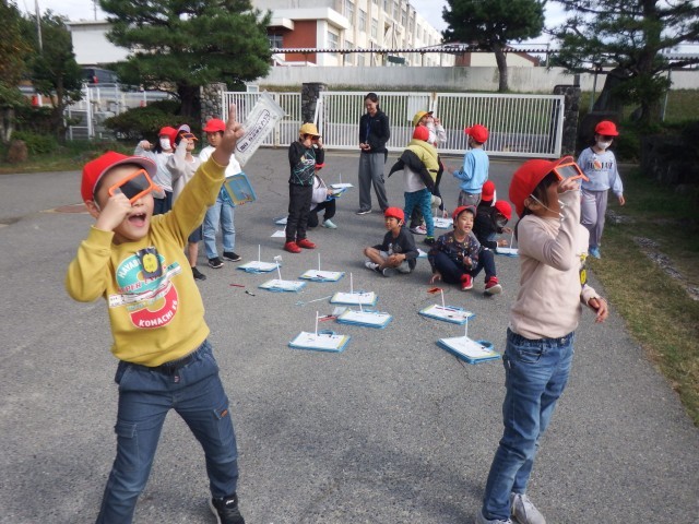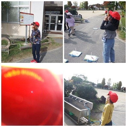 3年生 理科「かげのできかたと太陽」今日は、遮光めがねを使って太陽の観察を行いました。また、陰のできる場所の移り変わりを観察を通して調べることができました。