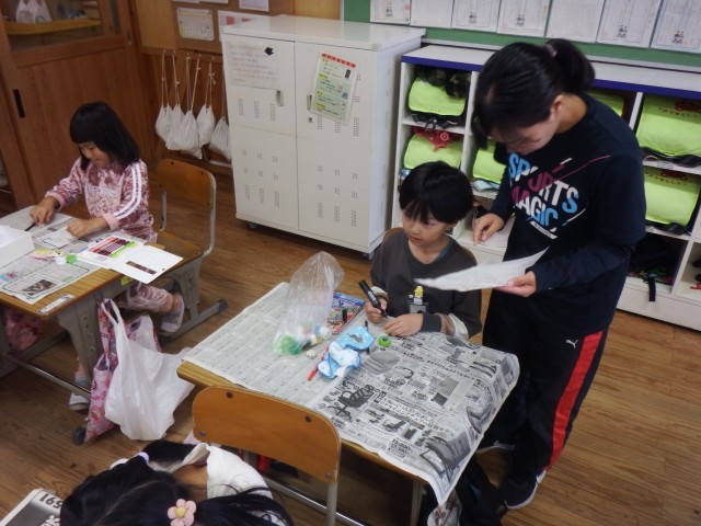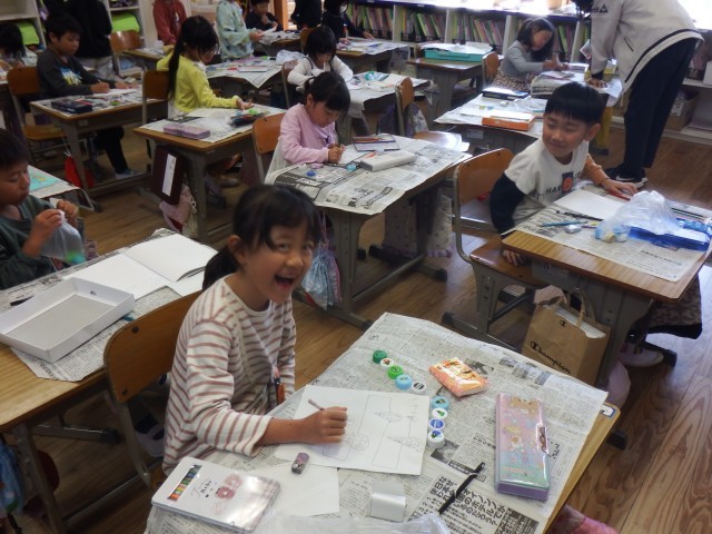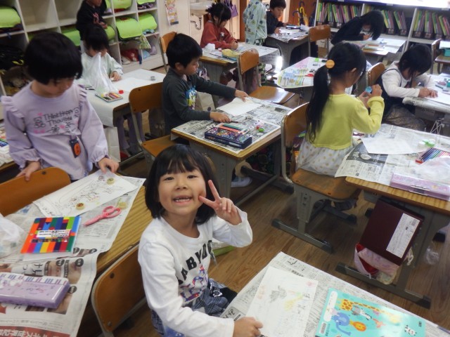 1年生 図画工作「おはなしすごろく」にっこにこでお話を考えています。どんな「すごろく」になるか楽しみですね!