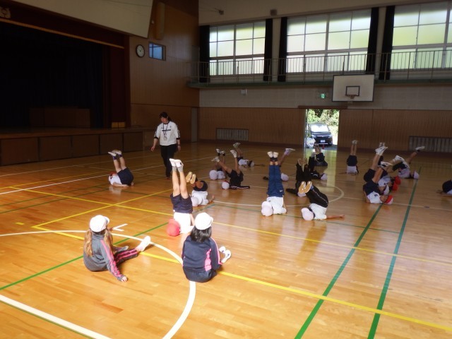 2年生 体育「跳び箱をつかった運動あそび」体育館で跳び箱に取り組みます。しっかりストレッチしてから臨みます!
