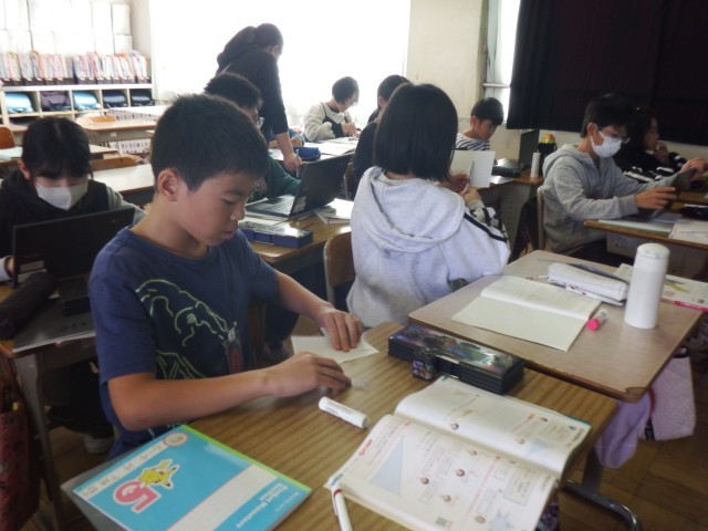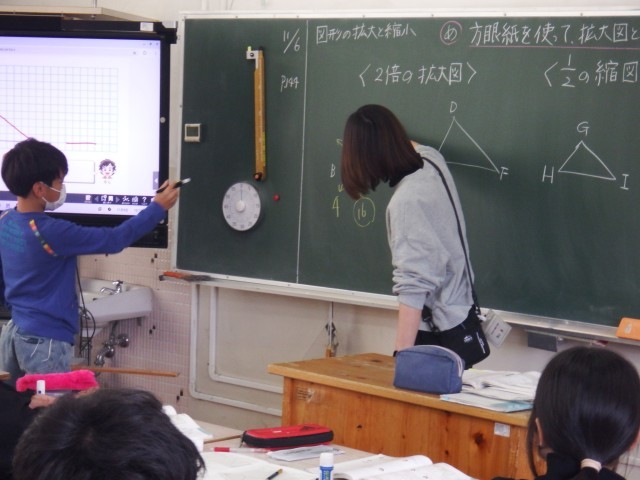 6年生 算数「図形の拡大と縮小」方眼紙を使って、拡大図(2倍)と縮小図(1/2倍)を書く方法を考えることができました。実際に作図をすることを通して、学びを深めることができました。