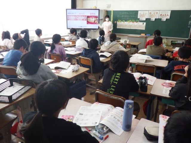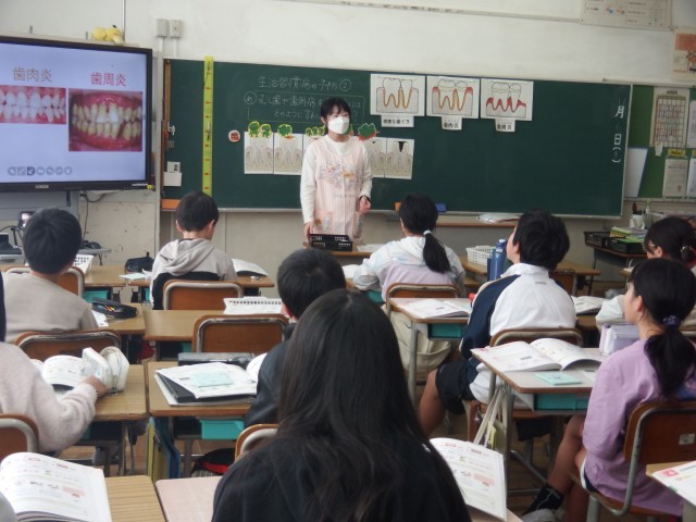 6年生 保健体育「生活習慣病の予防」体育科と養護教諭によるTT授業の様子です。今日は、むし歯や歯周病を予防するにはどのようにすればよいのかを学びました。