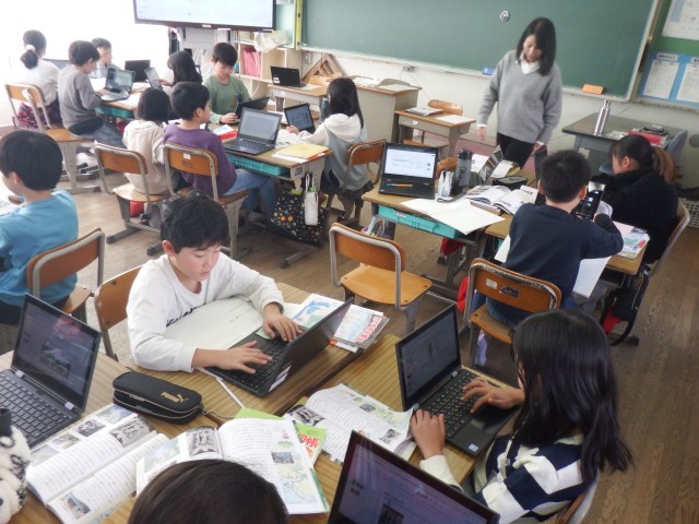 4年生 社会科「水はどこから?」タブレットを使って、学習のまとめを作成しています。分かったことなどを丁寧にまとめることができました。