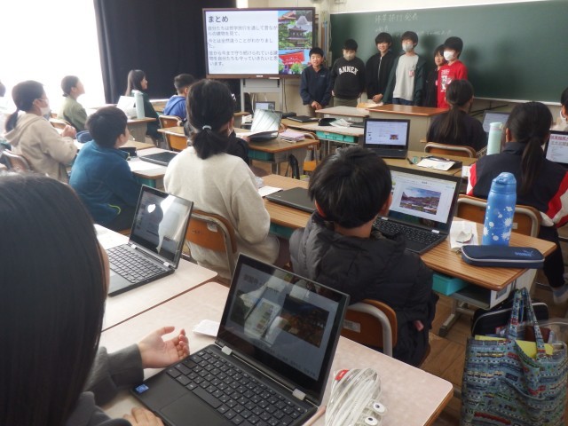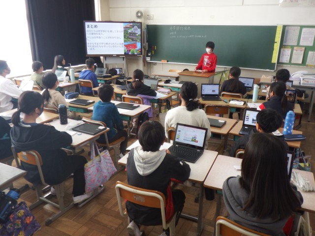 6年生 修学旅行のまとめ 修学旅行で学んだことをスライドにして発表会を行いました。グループでしっかり伝えることができましたね!