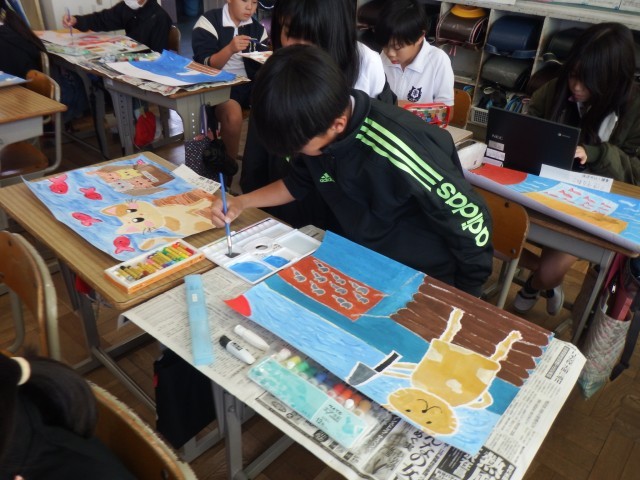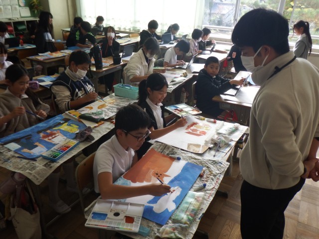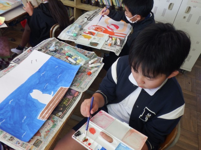 5年生 図画工作「読書感想画」いよいよ読書感想画が仕上がります!本を読みながら素敵な世界が広がっています。