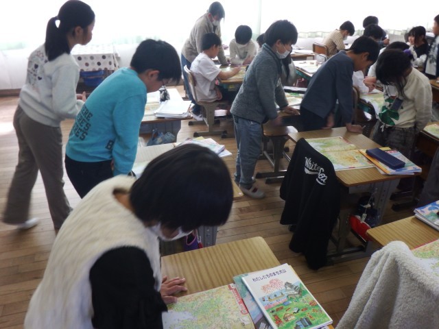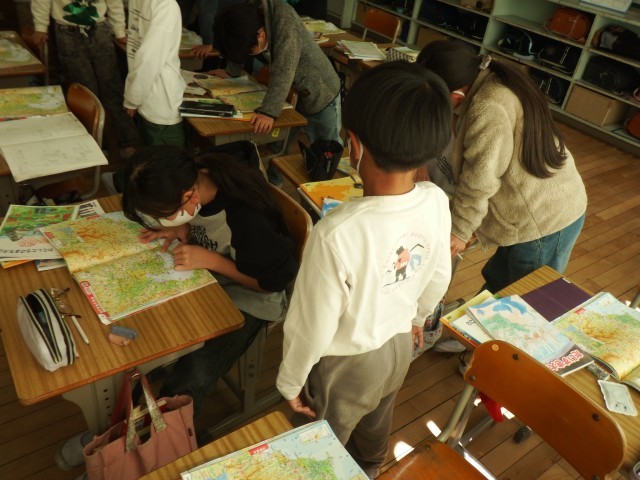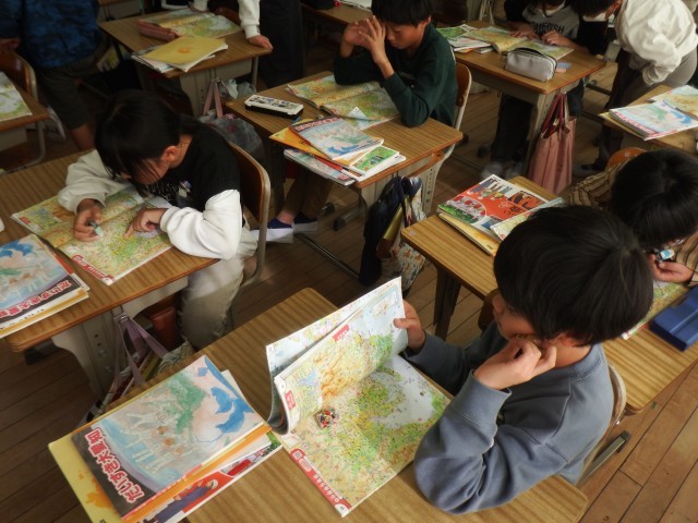 4年生 地図帳をじっくり見ています。それぞれの地域にはどのような特徴がありますか?地図帳は夢がいっぱい!?