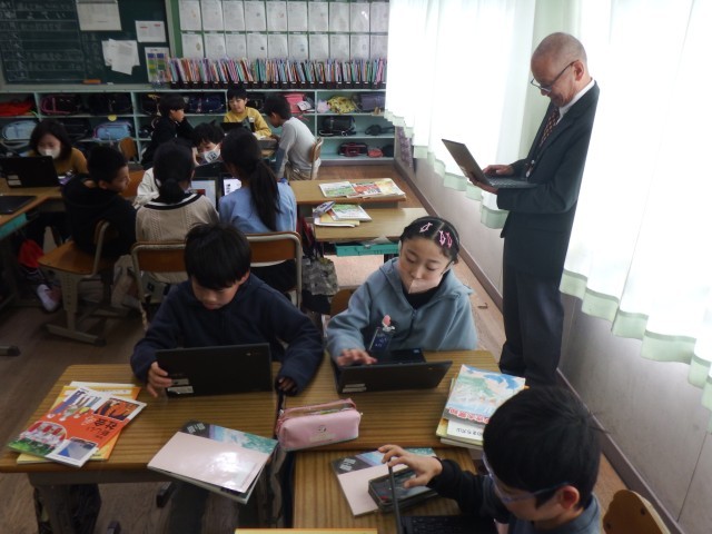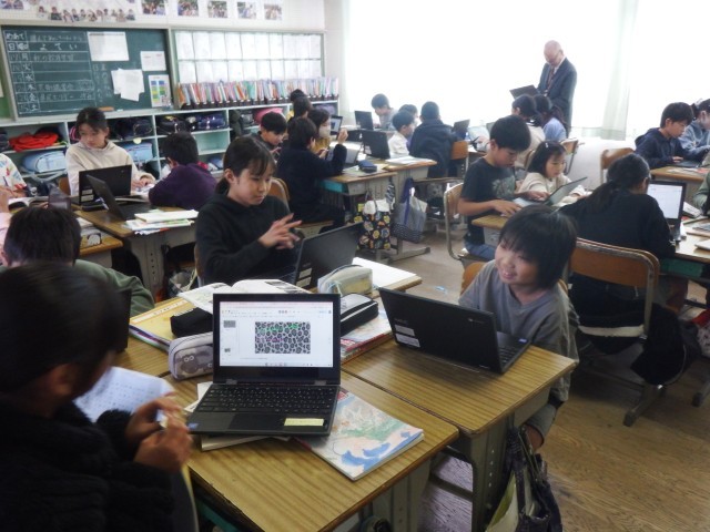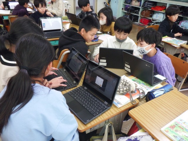 4年生 ラインズのICT授業 タブレットのプレゼンテーション作成アプリケーションを使って、調べ学習の成果スライドを作成しました。