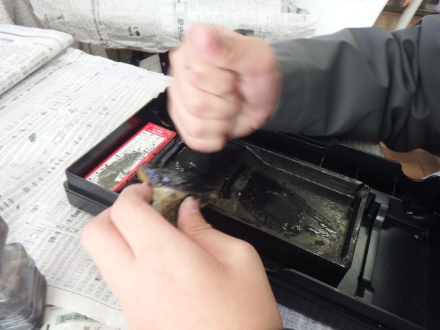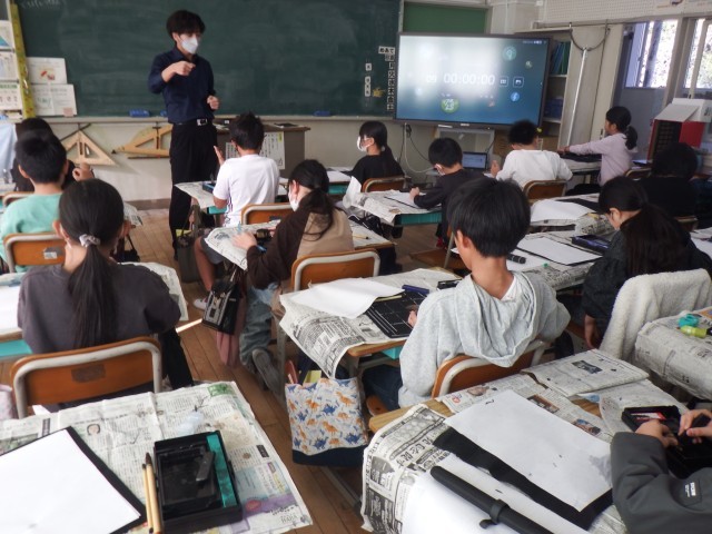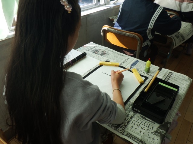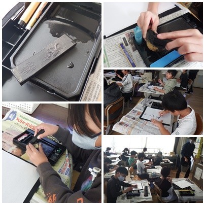 4年生 国語「未来につながる工芸品」今日は、実際に奈良県より奈良炭を取り寄せて、書道を行いました。炭をする経験や工芸品の思いにふれる経験をしています。