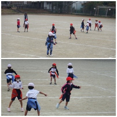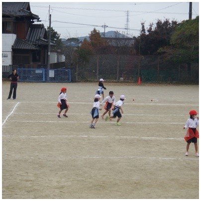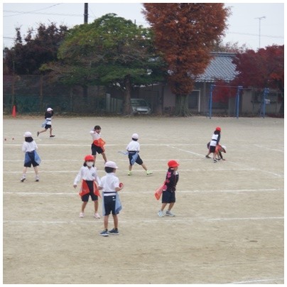 1年生 体育「タグラグビー」曇り空が広がっています。運動場でタグラグビーを行いました。たくさん動くと体が温まりますね!