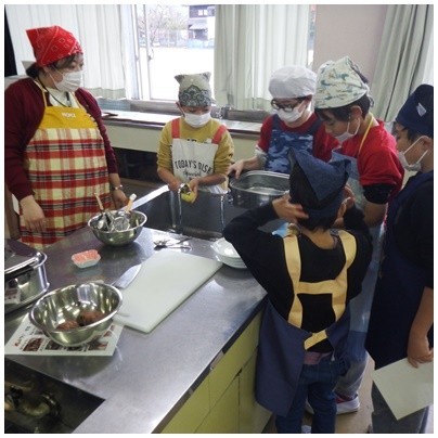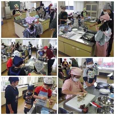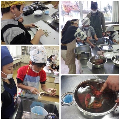 家庭科「サツマイモ実習」調理実習の様子です。今日は、収穫したサツマイモを使って調理を行います。力を合わせて、おいしいサツマイモ料理を作ります♪