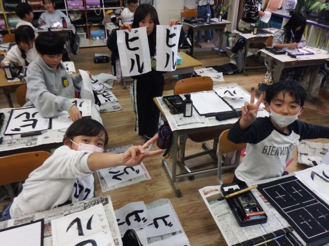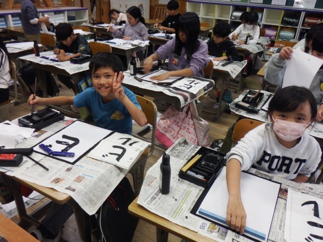 3年生 書写「ビル」毛筆、ビルの2回目練習です。バランス良く書くことができように練習をしました。