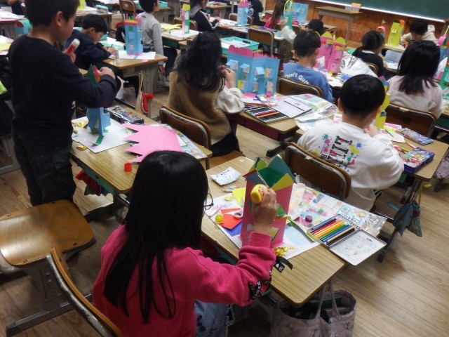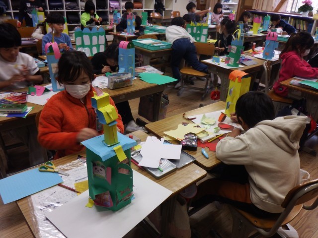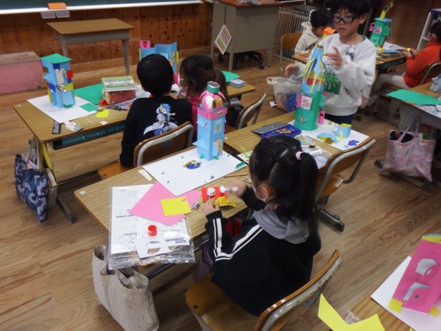 2年生 図画工作「まどをあけたら」作品作りに夢中で取り組んでいます。まどあけたら、なにが見えるかな?独創的な世界が広がっています。