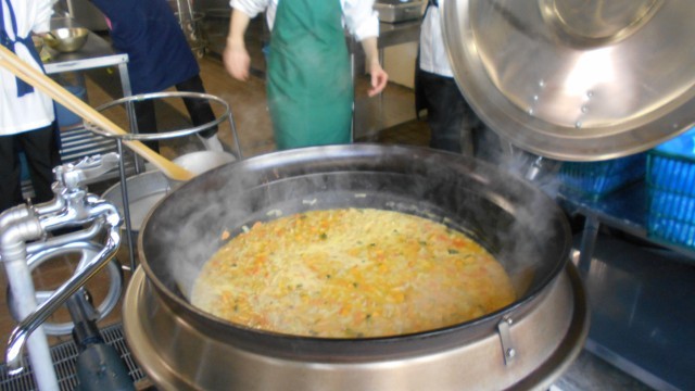 スープは、「ズッパーディ・ズッカ」という名前の南瓜(かぼちゃ)入りのミルクスープです。ドロンとしたとろみのついたシチューではなく、さらっとしたスープです。南瓜には、風邪の予防に良いビタミンがたっぷりと含まれていますよ!イタリア料理をおいしくいただきましょう♬